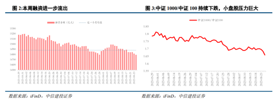 市场延续缩量,小盘股压力尤甚。本周市场成交额维持低迷,两市成交额除周二外均未能超过8000亿元,换手率在0.7%附近,两市融资余额降至七月下旬以来最低位,显示出投资者情绪跌至冰点。本周北向资金大幅流出224.2亿元,小盘股压力最大,杀跌比较严重,大量止损盘平仓,大盘股扛跌,尤其是有政策支持的证券和地产,本周表现稳定的以中字头大盘股为主,高股息为主。