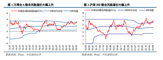 从股债性价比的角度来说,近期A股隐含风险溢价水平大幅上升,并处于较高水平,这标志着当前时点是A股较好的中长期买点,权益资产性价比非常高。其中,万得全A和沪深300隐含风险溢价水平都已经超过近8年来90%分位。