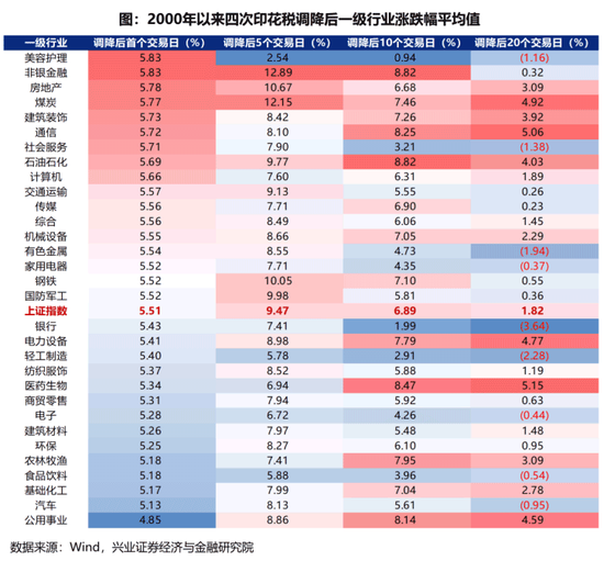 行业层面,兴业证券认为,印花税调降后市场短期内会呈现出一定超跌反弹特征,前期超跌行业在印花税调降后涨幅排名相对居前。从具体行业表现看,调降后首个交易日,美容护理、非银金融、房地产、煤炭、建筑装饰平均涨幅居前;调降后5个交易日,非银金融、煤炭、房地产、钢铁、国防军工平均涨幅居前。