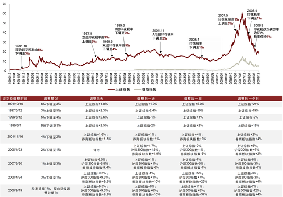 降低印花税对于短期市场情绪提振明显、券商板块表现尤甚;关注此次政策组合拳的长期积极影响。回顾97年以来A股印花税的5次下调(详见图1),调整当天大盘及券商指数均有明显涨幅,其中08年的2次下调沪深300及券商指数接近涨停;调整后一周来看,其中共4次大盘及券商指数录得正收益,且券商板块显著跑赢;调整后一月来看;大盘表现有所分化,券商板块仍实现正收益。距前次调整时隔十五年、距本次政治局会议的部署要求仅一个月时间,我们认为此次印花税下调的时间及幅度均超预期;政策力度的加强,一方面有助于直接提振市场信心,另一方面也强化了资本市场政策的积极信号,助力市场在“引入源头活水、降低交易成本、提高交易畅通性”等长期问题上取得突破、并推进各部委形成政策合力,中长期维度促进市场积极稳健发展。