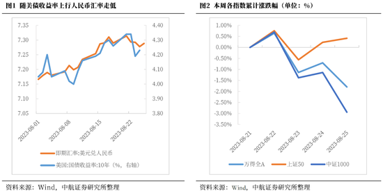 本周北向资金出现净买入拐点。与国内经济预期相关性较强的上证50指数涨幅居前,或反映出市场对经济修复的信心。截至8月24日南华工业品指数升至年内高点,前期随着美国长端债券增发,美债收益率上探、人民币贬值。且由于供给收紧,油价上行,8月24日布伦特原油期货结算价较今年低点的71.84美元/桶(6月12日)已抬升16.04%,引发市场对8月通胀数据的担忧,带动北向资金持续流出。8月24日北向资金结束了连续13个交易日的净卖出转为净买入,但8月25日由于美联储官员表示不排除进一步加息的可能北向资金再度流出,拖拽市场再次翻绿,但上证50延续涨势。我们认为对海外紧缩压力的悲观情绪或已得到较充分宣泄,往后看流入情况有望趋于稳定,带动市场信心企稳。