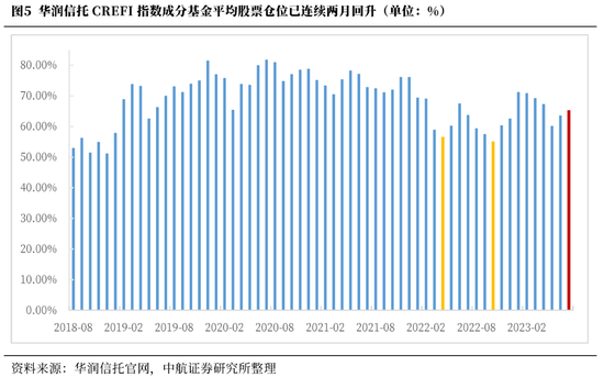 回顾2022年,市场曾于4月、10月触底,当前杠杆资金买入占比及调仓较为灵活的私募基金仓位均显示目前市场情绪对比前两轮底部区间较好。杠杆资金对比前两轮底部区间均更为活跃。私募基金仓位方面,2023年7月CREFI成分基金平均股票仓位对比前两轮底部区间,资金活跃程度或更高,或反映出投资者情绪较为乐观。且无论是杠杆资金买入占比还是私募基金仓位近期都有回升趋势。随着活跃资本市场政策陆续落地,人民币币值逐步稳定,市场信心有望得到进一步改善。