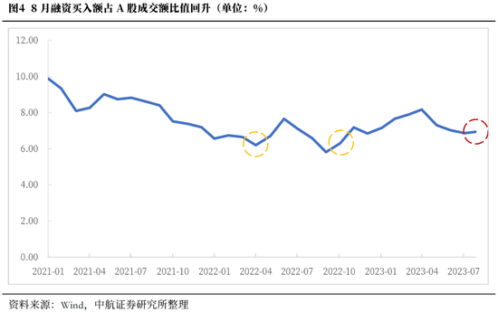 回顾2022年,市场曾于4月、10月触底,当前杠杆资金买入占比及调仓较为灵活的私募基金仓位均显示目前市场情绪对比前两轮底部区间较好。杠杆资金方面,截至2023年8月25日,8月融资买入额占全部A股成交额达6.94%,对比前两轮底部区间均更为活跃,2023年8月相较2022年4月的6.2%增加0.74%,相较于2022年10月的6.31%增加0.63%。私募基金仓位方面,我们通过华润信托CREFI成分基金平均股票仓位观察私募基金仓位情况,2023年7月CREFI成分基金平均股票仓位达65.28%,对比前两轮底部区间,资金活跃程度或更高,2023年7月相较2022年4月的56.51%增加8.77%,相较于2022年10月的55.06%增加10.22%,或反映出投资者情绪较为乐观。且无论是杠杆资金买入占比还是私募基金仓位近期都有回升趋势,截至2023年8月21日8月融资买入额占A股成交额比例较7月边际回升0.07%,CREFI成分基金平均股票仓位自2023年5月60.18%的低点后已连续两月回升共5.10%。随着活跃资本市场政策陆续落地,人民币币值逐步稳定,市场信心有望得到进一步改善。