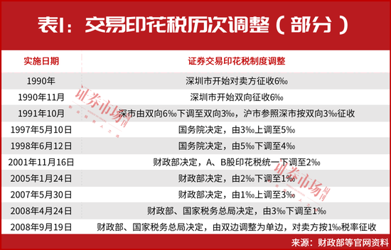 证券交易印花税从普通印花税发展而来,专门针对股票交易发生额而征收。在本次调降征收印花税之前,A股的印花税税率为1‰。