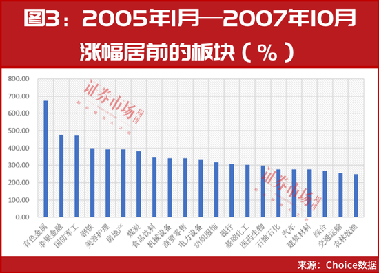 再如2005年1月~2007年10月,同样在印花税下调后市场迎来上涨阶段,有25个行业涨幅超过2倍,有色金属、非银金融、国防军工涨幅均超过4倍(见图3)。