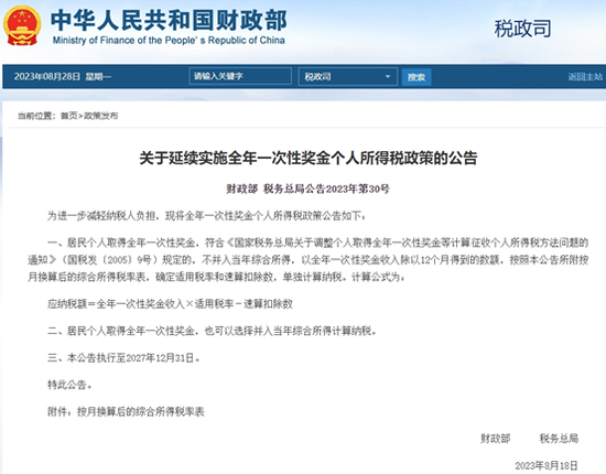 8月28日,财政部、税务总局发布《关于延续实施全年一次性奖金个人所得税政策的公告》,相关政策将执行至2027年12月31日。