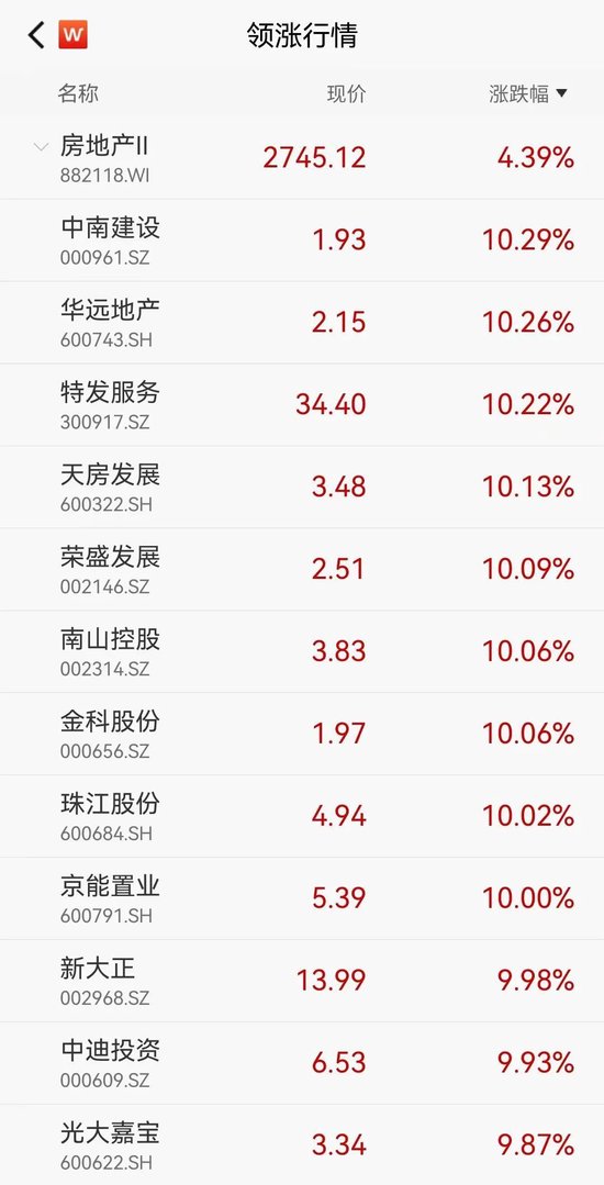 从涨幅居首的房地产板块个股表现来看,中南建设、华远地产、特发服务、天房发展、荣盛发展、南山控股、金科股份、珠江股份、京能置业、新大正、中迪投资等多股涨停或涨幅超10%,光大嘉宝、津滨发展、信达地产、南国置业、深物业A、迪马股份、栖霞建设、光明地产、京投发展等个股亦大幅拉升。