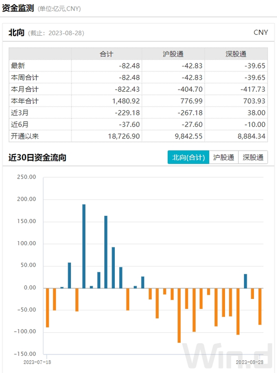 8月28日,北上资金大幅净流出82.48亿元,本月已净卖出822.43亿元,单月净卖出额续刷历史新高,且大幅超过2020年3月份的679亿元。从近日北上资金变动情况看,此前连续大幅净卖出后仅短暂流入1天,然后延续此前大幅净流出态势。