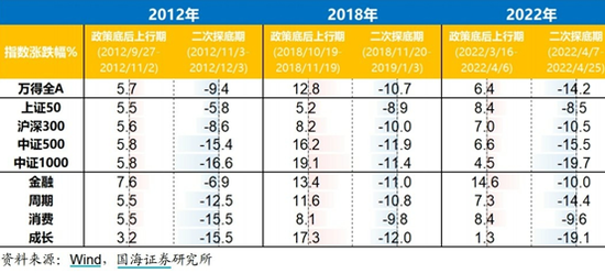 国海证券分析认为,历史上可与当下类比的三轮典型的政策底分别发生在 2012 年 9 月、2018 年 10月和 2022 年 3 月,政策底发生后市场底形成的时间在 1.5 至 2.5 个月之间。政策底发生后市场往往会短暂反弹,随后再二次探底形成市场底,反弹和探底两阶段风格大概率保持一致。