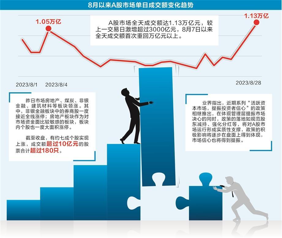 反映市场活跃度的市场交投也全面趋向活跃,A股市场全天成交额达1.13万亿元,较上一交易日激增超过3000亿元,8月7日以来成交额首次重回万亿元以上。当天市场中,两只券商龙头股东方财富和中信证券成交双双突破百亿元;成交额超过10亿元的股票合计超过180只,交投火爆情形为今年以来罕见。