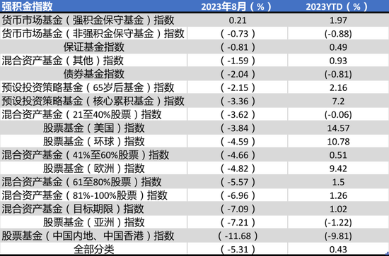 5.31%的投资亏损可能是强积金自2022年9月以来最大幅度的按月亏损,并有可能将抵消今年头7个月超过投资收益的80%。8月份的投资亏损估算约为534 亿港元(相等于 469 万名强积金成员每人平均亏损约11400港元)。计入供款后,预计截至8月底强积金总资产约为1.099万亿港元(2023 年年初至今增加约476亿港元),相等于成员平均账户结余约为 234100 港元。