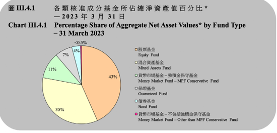 不仅如此,香港强积金的资产配置也体现了多元、分散的特征。例如,股票基金占总资产比例为43%、混合基金占比为35%,货基-强积金保守基金占比为11%、保证基金占比为7%、债券基金占比为4%、货基-不包括强积金保守基金占比小于0.5%。