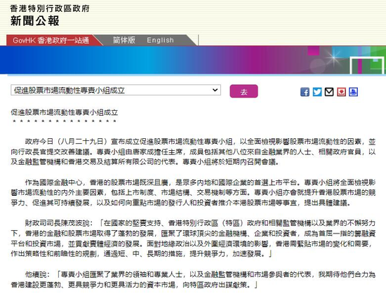 8月29日港股收盘后,中国香港特区政府正式宣布,成立促进股票市场流动性专责小组,以全面检视影响股票市场流动性的因素,专责小组将于短期内召开会议。稍早之前,香港证券及期货专业总会发声,要求撤销股票印花税。