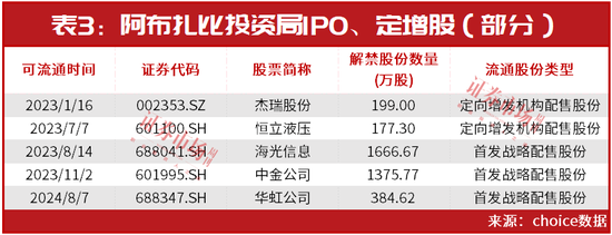 此外,据不完全统计显示,阿布扎比投资局近阶段通过首发、定增方式布局的公司还包括石油设备公司杰瑞股份、机械装备制造公司恒立液压、芯片公司海光信息以及证券公司中金公司等(见表3)。