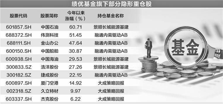 从今年以来表现较好的基金情况看,除重仓股的贡献外,绩优基金的良好表现与隐形重仓股也密不可分,如景顺长城鲍无可的隐形重仓股中国石油、中国海油、浩洋股份年内涨幅超20%,融通基金范坤的隐形重仓股金山办公、中国船舶、伟测科技年内涨幅超30%,大成基金徐彦的隐形重仓股厦门空港、博迈科今年以来累计涨幅均超10%。