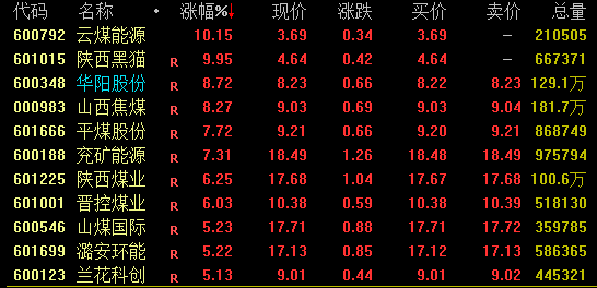 煤炭板块盘中大幅走高,截至收盘,云煤能源、陕西黑猫涨停,华阳股份、山西焦煤涨超8%,平煤股份、兖矿能源涨超7%,陕西煤业涨逾6%。