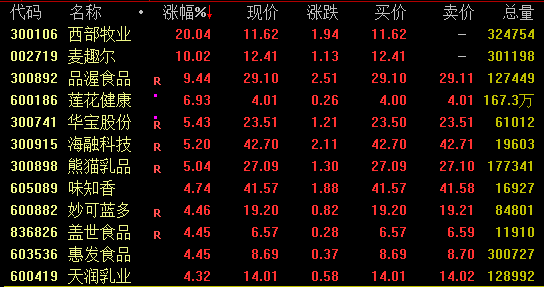 食品饮料板块今日强势拉升,截至收盘,西部牧业、麦趣尔涨停,品渥食品涨超9%,华宝股份、海融科技、熊猫乳品等涨超5%。