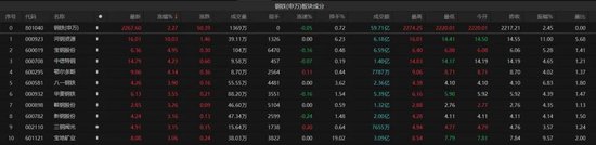 钢铁板块大涨2.27%,涨幅仅次于“煤老板”。板块内42只个股收涨,仅2只个股收跌。具体来看,河钢资源涨停,宝钢股份、中信特钢、鄂尔多斯涨超4%。