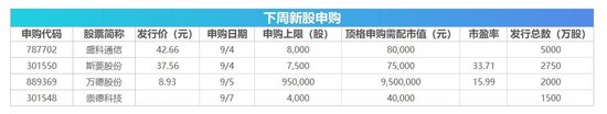 下周,A股将有4只新股网上发行,其中9月4日周一发行的是盛科通信、斯菱股份;9月5日周二发行的是万德股份;9月7日周四发行的是崇德科技。