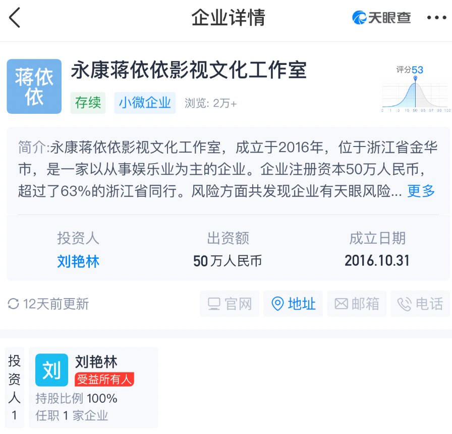 记者登录天眼查APP发现,目前,永康蒋依依影视文化工作室经营状态依然为“存续”状态,其注册资本为50万人民币,投资人、受益人均为刘艳林。