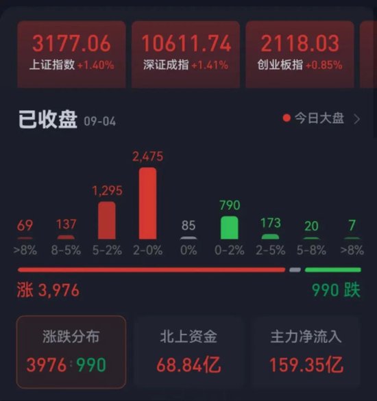 周一(9月4日),A股三大股指震荡上行,全线飘红。截至收盘,上证指数涨1.40%,收报3177.06点;深证成指涨1.41%,收报10611.74点;创业板指涨0.85%,收报2118.03点。沪深两市合计成交额达8848.61亿元,北向资金净买入68.84亿元。总体上看,两市个股涨多跌少,近4000只个股上涨。其中,涨停个股达57只,跌停个股达2只。