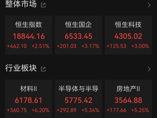 恒生指数全日收报18844.16点,涨2.51%;恒生国企指数全日收报6533.45点,涨3.17%;恒生科技指数涨3%,报4305.02点。大市全日成交总额1526.87亿元港元,南向资金流入42.99亿港元。