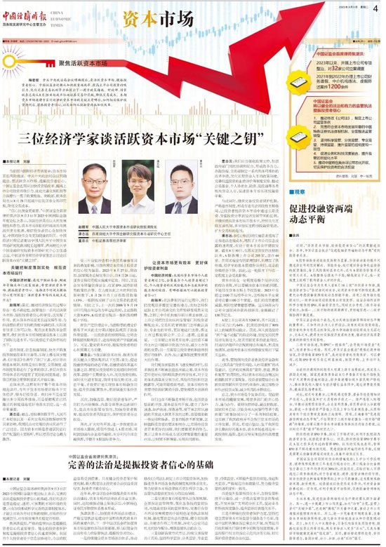 编者按 中共中央政治局会议明确提出,要活跃资本市场、提振投资者信心。中国证监会近期从加快投资端改革、提高上市公司投资的吸引力、优化完善交易机制等方面提出了一揽子政策措施。财政部、国家税务总局从8月28日起减半征收证券交易印花税,降低交易成本。本期资本市场邀请专家讨论活跃资本市场的关键点有哪些,如何切实保护投资者利益、提振投资者信心,以及如何从投融资两端加快改革。