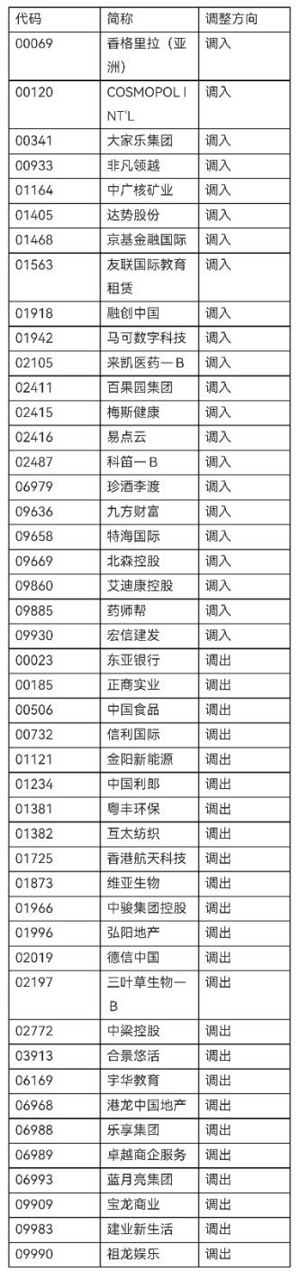 其中,融创中国、香格里拉(亚洲)、珍酒李渡、百果园、九方财富等22只股票被调入,东亚银行、中国食品、信利国际等27只股票被调出。自2023年09月05日起生效。