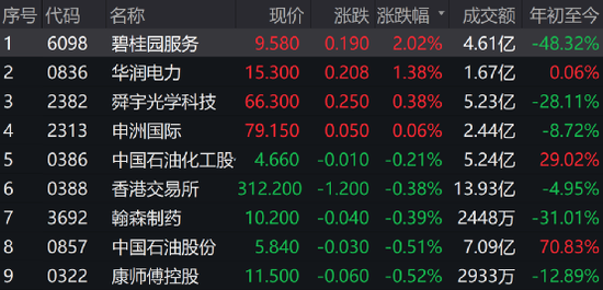 碧桂园服务涨2.02%,华润电力涨1.38%,舜宇光学科技涨0.38%,领涨蓝筹。融创中国获纳入港股通名单,大涨逾25%。