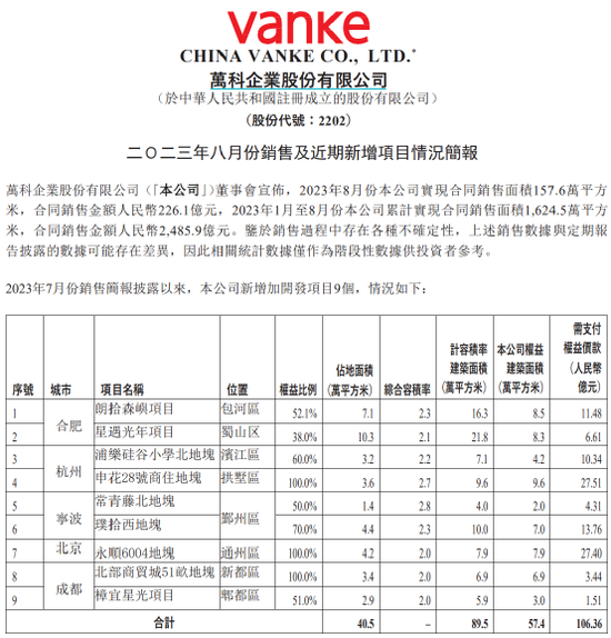 9月5日收盘后,万科企业在港交所发布公告称,8月份公司实现合同销售面积157.6万平方米,合同销售金额226.1亿元。2023年1月至8月份公司累计实现合同销售面积1,624.5万平方米,合同销售金额人民币2,485.9亿元。
