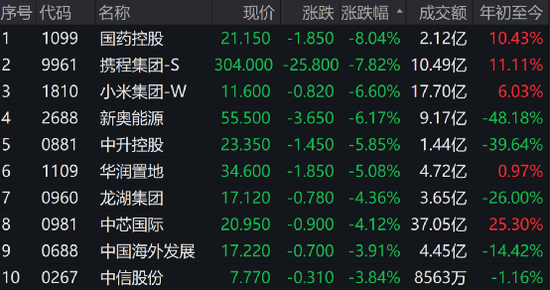 国药控股跌8.04%,携程集团跌7.82%,小米集团跌6.60%,领跌蓝筹。热门题材半导体、AI回落,商汤跌近5%,中芯国际跌超4%。