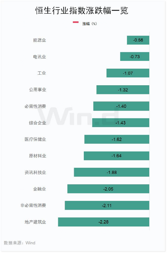 恒生行业指数全线下跌,内房、消费、大金融、科技跌幅居前。从行业表现看,恒生行业指数日内全线下跌,地产建筑业跌2.28%,非必需性消费跌2.11%,金融业跌2.05%。
