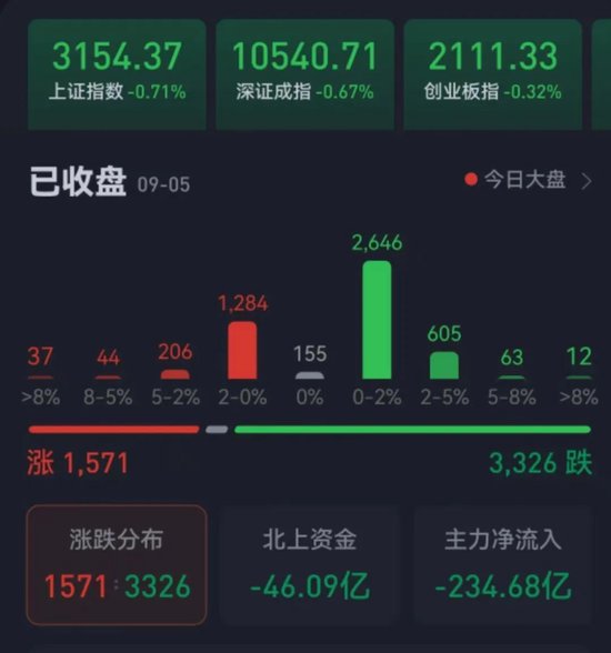 周二(9月5日),A股三大股指震荡回落。截至收盘,上证指数跌0.71%报3154.37点,深证成指跌0.67%报10540.71点,创业板指跌0.32%报2111.33点;两市合计成交金额达8038.57亿元,北向资金净卖出46.09亿元。总体上看,两市个股跌多涨少。其中,涨停个股达23只,跌停个股达5只。