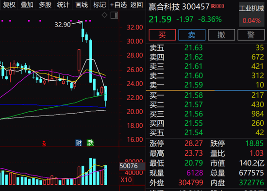 昨日大幅反弹的赢合科技(维权)今天大跌,收盘跌超8%。在短短的7个交易日,该股最大回调幅度接近37%。8月28日,该股最高价达到32.9元,今天最低价仅为20.79元。