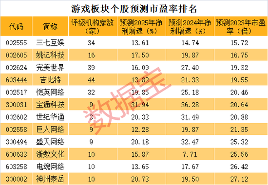 根据机构一致预测今年净利计算,游戏板块中有12只个股预测市盈率不足30倍;其中,吉比特、完美世界、姚记科技、三七互娱(维权)等个股预测市盈率不足20倍。成长性来看,盛天网络、世纪华通、宝通科技等个股机构一致预测明年及2025年净利增速均超20%。