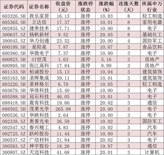 具体热点看,今日,光刻胶板块领涨,杨帆新材、广信材料、蓝英装备、容大感光等4只个股20CM涨停,盛剑环境、张江高科10CM涨停;卫星导航板块全天强势,震有科技、天迈科技、华力创通、神宇股份等4只个股20CM涨停,华体科技、深赛格10CM涨停;房地产开发板块午后快速拉升,中国武夷、张江高科涨停;另有电子化学品、汽车芯片、6G概念、国防军工、富士康概念、通信设备等板块表现活跃。厨卫电器领跌,港口航运、机场航运、手机游戏等板块跌幅居前。