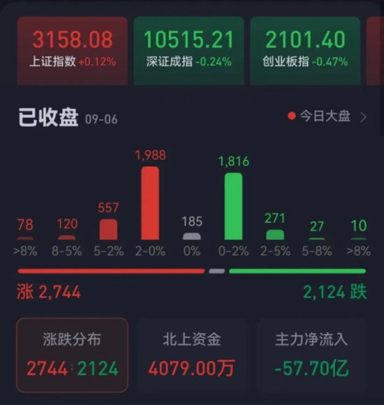 周三(9月6日),A股三大股指震荡分化,涨跌不一。截至收盘,上证指数涨0.12%报3158.08点,深证成指跌0.24%报10515.21点,创业板指跌0.47%报2101.4点;两市合计成交金额达7712.08亿元,北向资金净买入4079万元。总体上看,两市个股涨多跌少。其中,涨停个股达38只,跌停个股达5只。