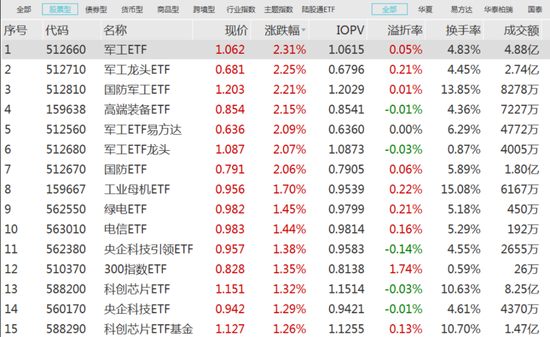 从股票ETF二级市场表现来看,今日国防军工主题ETF领涨。其中军工ETF、军工龙头ETF、高端装备ETF等多只产品涨幅超2%。