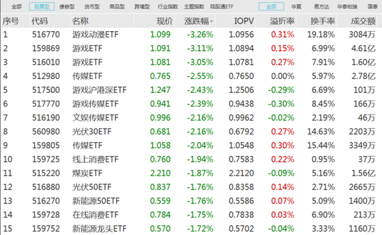 随着游戏、传媒等板块调整,相关主题ETF今日跌幅居前。其中,跌幅前三均为游戏主题ETF产品,今日跌幅均超3%。