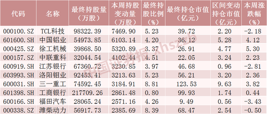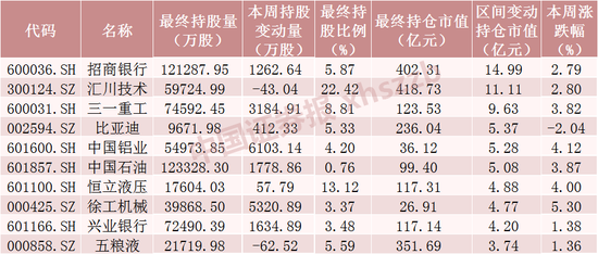 本周北向资金持仓市值增加额前十的股票中,除汇川技术、五粮液分别被减仓43.03万股、62.52万股外,其他股票均被加仓,其中对招商银行、三一重工、中国铝业、中国石油、徐工机械、兴业银行的持股增加数超1000万股。