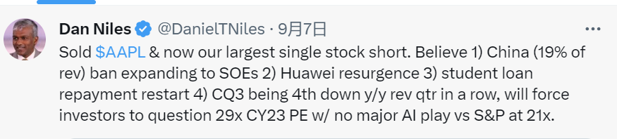 对冲基金Satori Fund创办人Dan Nile表示苹果是他作空最多的个股,他上周在社交平台发文表示:‘卖出苹果了。现在苹果是我作空最多的个股。’