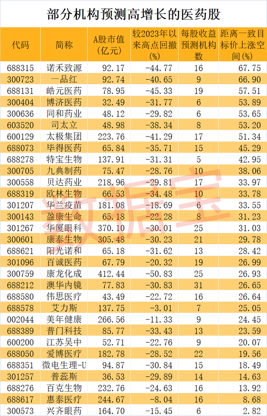 部分医药股未来增长潜力获机构看好。数据宝统计,根据5家以上机构一致预测,今明两年净利润增速均有望超30%的医药股有36只。这些高增长潜力股中,最新收盘价较年内高点平均回撤30.01%。康龙化成、西山科技、皓元医药、诺禾致源、太极集团、卫信康、一品红回撤幅度超40%。