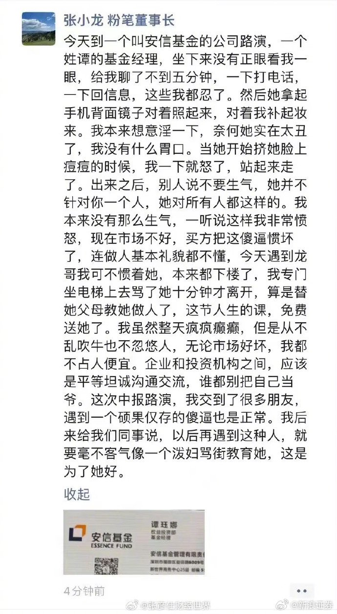 粉笔CEO张小龙怒怼安信基金谭珏娜:补妆、挤痘痘,不正眼看,连基本礼貌都不懂,骂了十分钟才离开