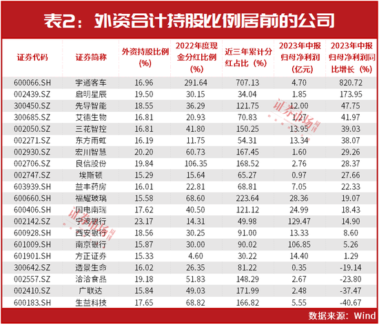 在华测检测等外资“团宠股”之外,还有部分公司的外资持股占比接近24%。如截至目前,据Wind统计,外资持股占比在15%以上的公司还有19家,其中宁波银行的外资持股占比最高为23.17%(见表2;未包括外资私募持股,且QFII/RQFII持仓为二季度末数据)。