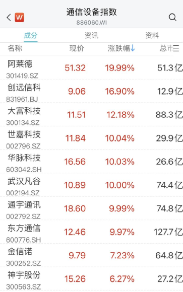 通信设备板块掀涨停潮,6G概念股涨幅居前,阿莱德20CM涨停,世嘉科技、华脉科技、通宇通讯、武汉凡谷(维权)、东方通讯等纷纷涨停,创远信科、大富科技等涨幅居前。