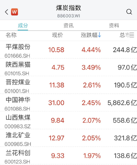 煤炭股集体走强,平煤股份涨超4%,陕西黑猫、晋控煤业、中国神华等涨超2%。