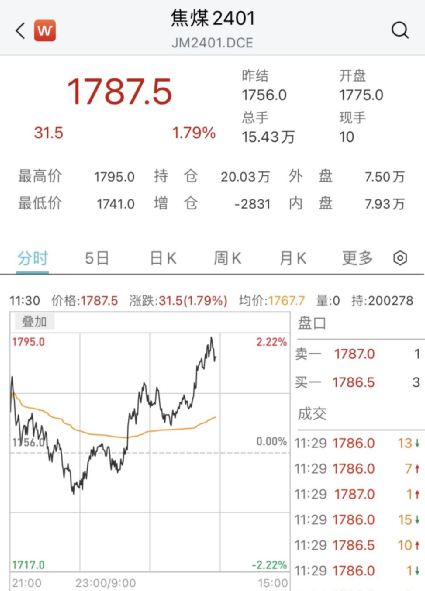 焦煤主力合约日内涨幅一度扩大至2%,现报1787.5元/吨。