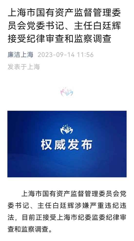 据上海市纪委监委9月14日消息:上海市国有资产监督管理委员会党委书记、主任白廷辉涉嫌严重违纪违法,目前正接受上海市纪委监委纪律审查和监察调查。