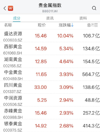 此外,黄金概念股震荡走高,盛达资源(维权)涨停,西部黄金一度涨超7%,湖南黄金、中金黄金、四川黄金等跟涨。