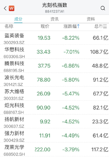 光刻机概念大幅回调,蓝英装备跌超8%,腾景科技、波长光电、扬帆新材等跌幅居前。